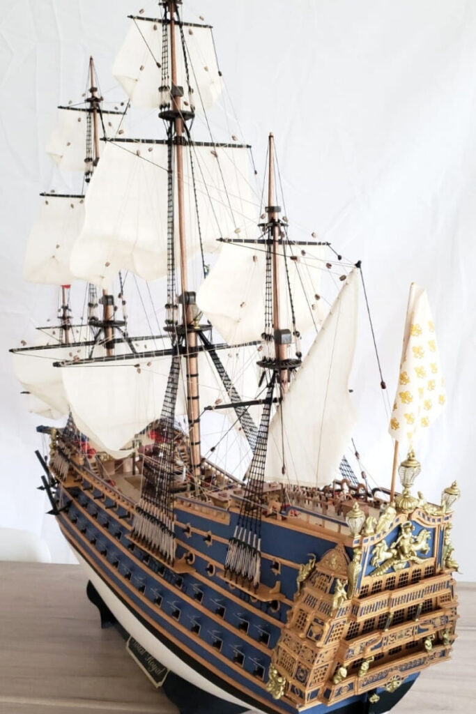 Cada detalle ha sido cuidadosamente trabajado para reproducir la majestuosidad, el equilibrio estructural y la extraordinaria decoración barroca de uno de los navíos más emblemáticos de la flota de Luis XIV.